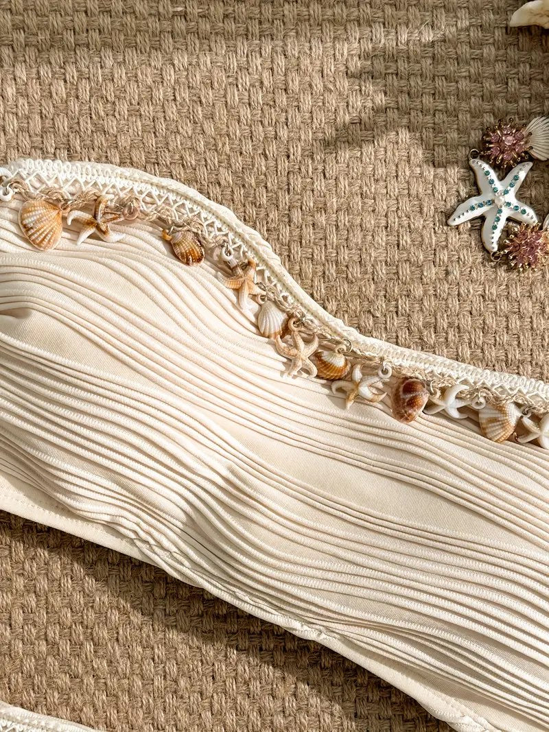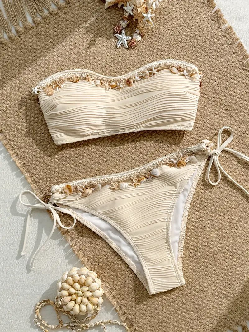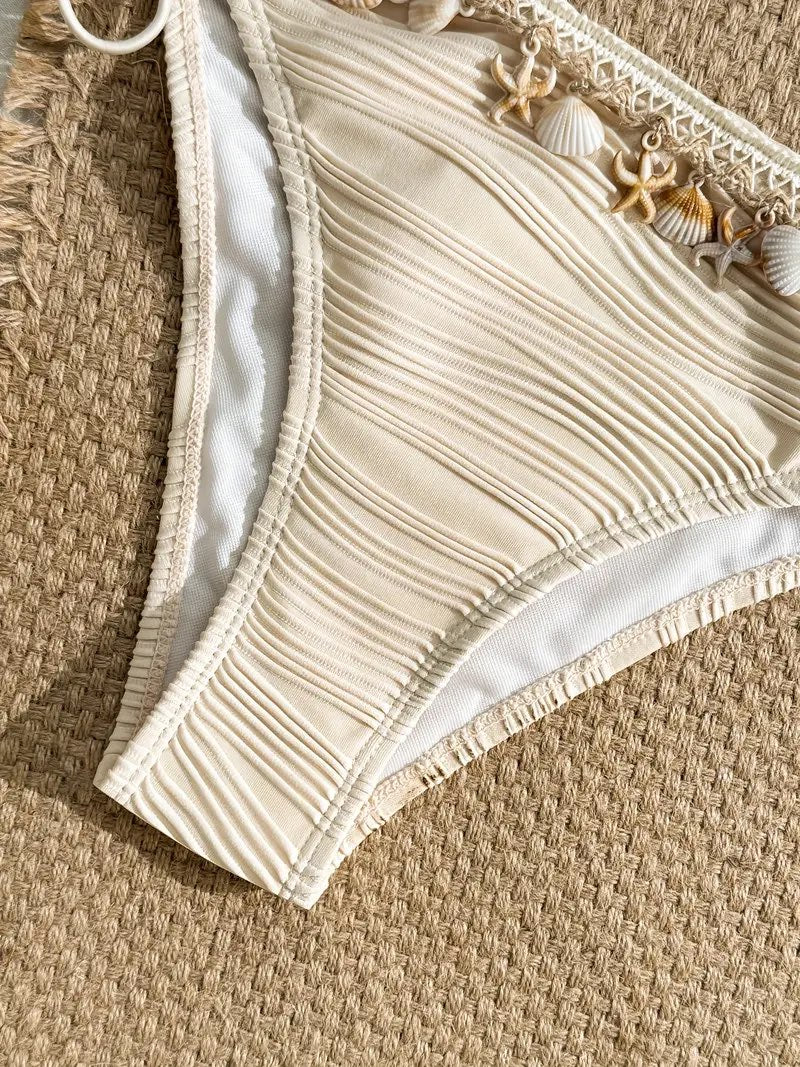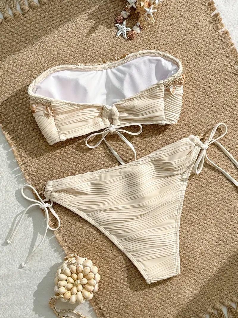 Conjunto de biquíni de moda para tamanho feminino - Bege, de alta elasticidade, com detalhes florais, sem costas, em tecido, perfeito para praia e piscina, roupa de banho para praia | Biquíni com detalhes florais | Tecido de alta elasticidade