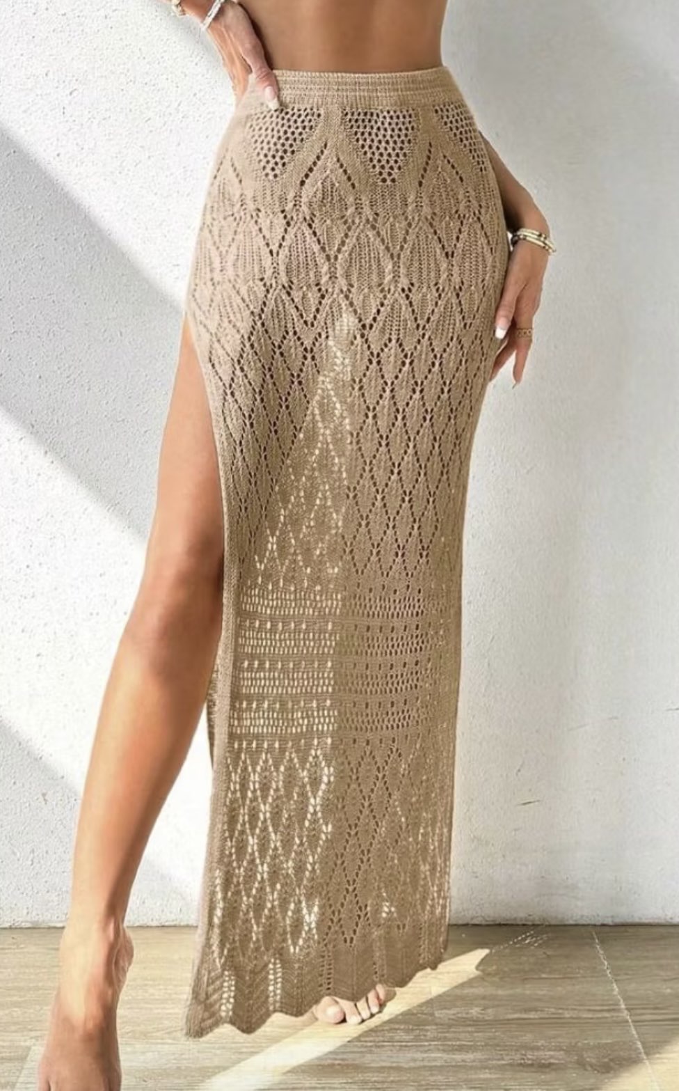 Saia Saída de Praia Longa Tricot com Fenda Lateral Trabalhado Rendando